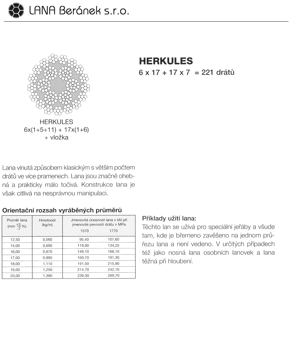 Lano je složeno ze dvou vrstev (1 vrstva: 6x17 drátů, 2 vrstva: 17x7 drátů, celkem tedy 221 drátů).